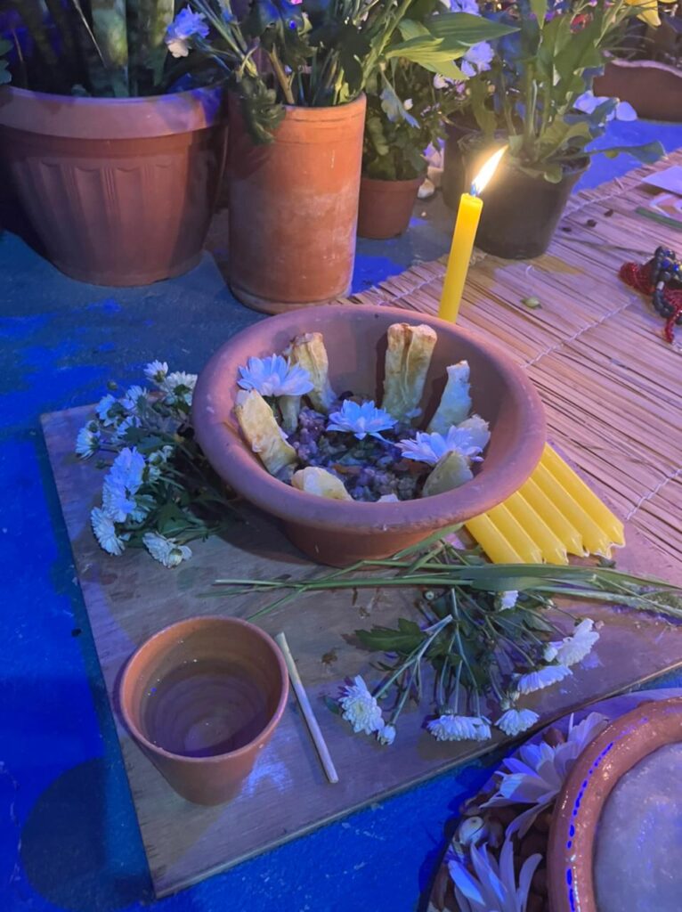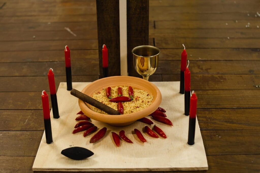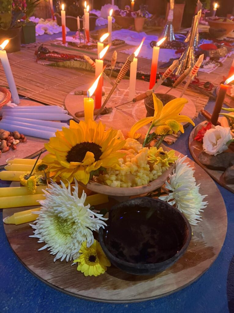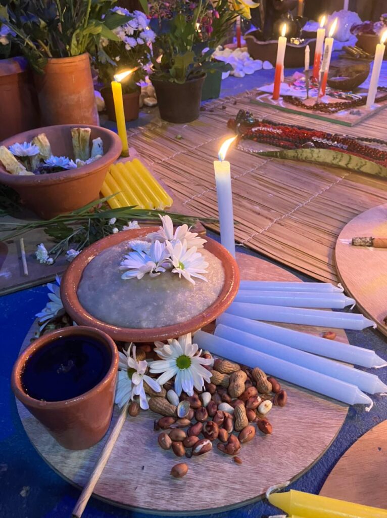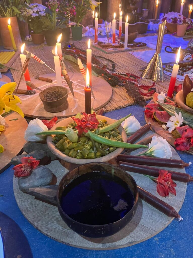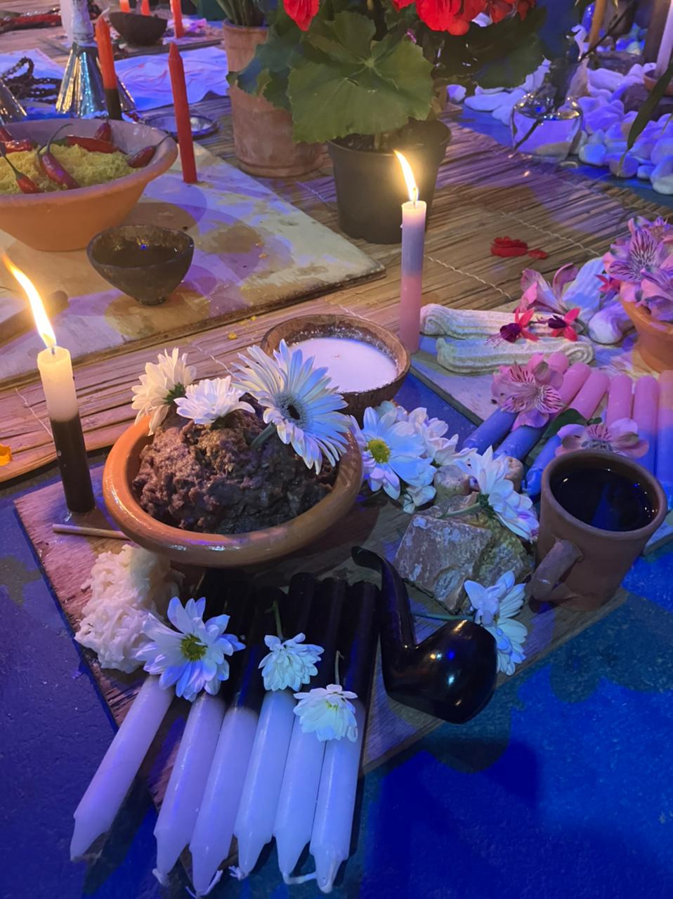 AMALÁ: Velas marrons, cerveja preta servida em coité, charuto e quiabo.