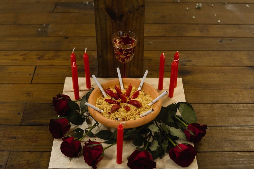 Amalá: velas de mel, arroz integral com frutas cristalizadas e frutas como: maçã, pêssego e uva dentro de uma gamela, mel tudo arranjado com flores. Bebida para o cigano vinho tinto, e para a cigana vinho branco. Para o cigano cigarro ou cigarrilha e para cigana cigarros.
