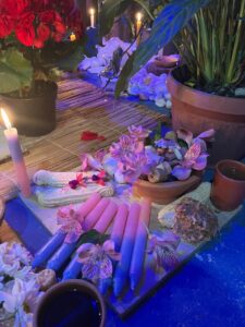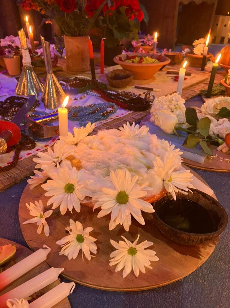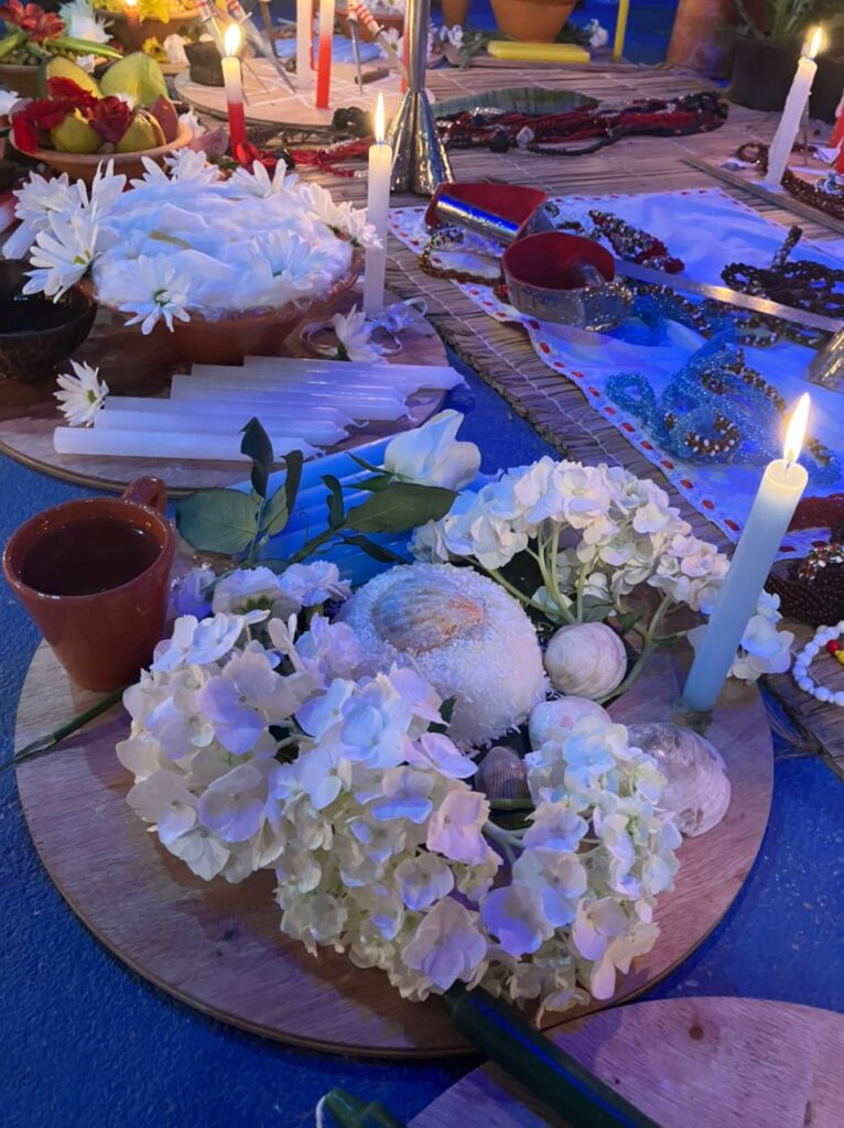 AMALÁ: Velas azuis, manjar de coco (amido de milho, leite e leite de coco, virou pudim, desligar o fogo), flores brancas e flores azuis, circula a oferenda com água.