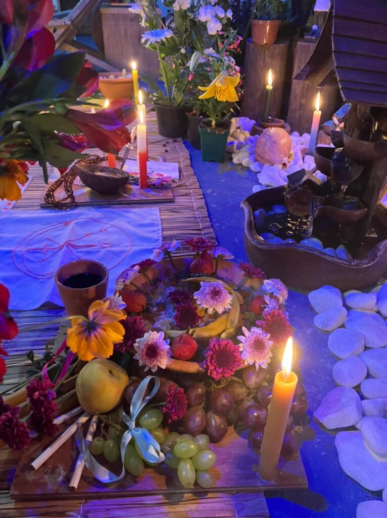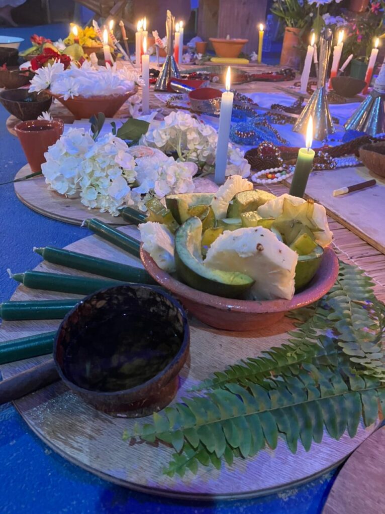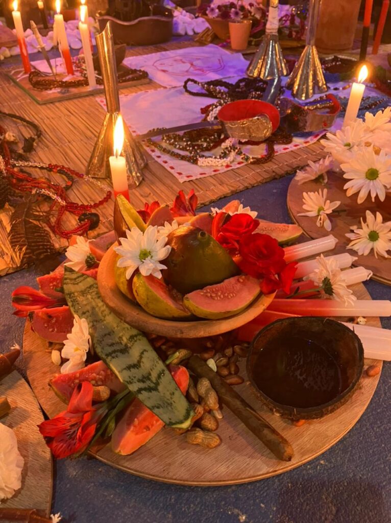 Amalá: Velas verdes, cerveja branca servida em coité, charutos e frutas (algumas frutas principais: maracujá, abacate, carambola, abacaxi).