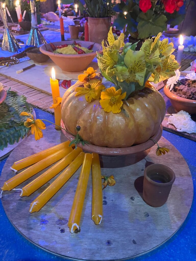 AMALÁ: velas cor laranja, água mineral, moranga com milho em espiga coberto com mel e flores.